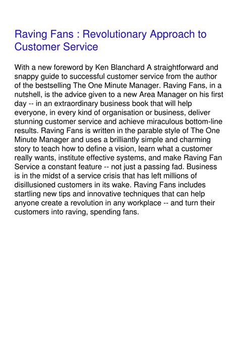 Download Raving Fans Revolutionary Approach Customer PDF online is a convenient and frugal way to read Raving Fans Revolutionary Approach Customer you love right from the comfort of your own home. Yes, there sites where you can get PDF "for free" but the ones listed below are clean from viruses and completely legal to use.
